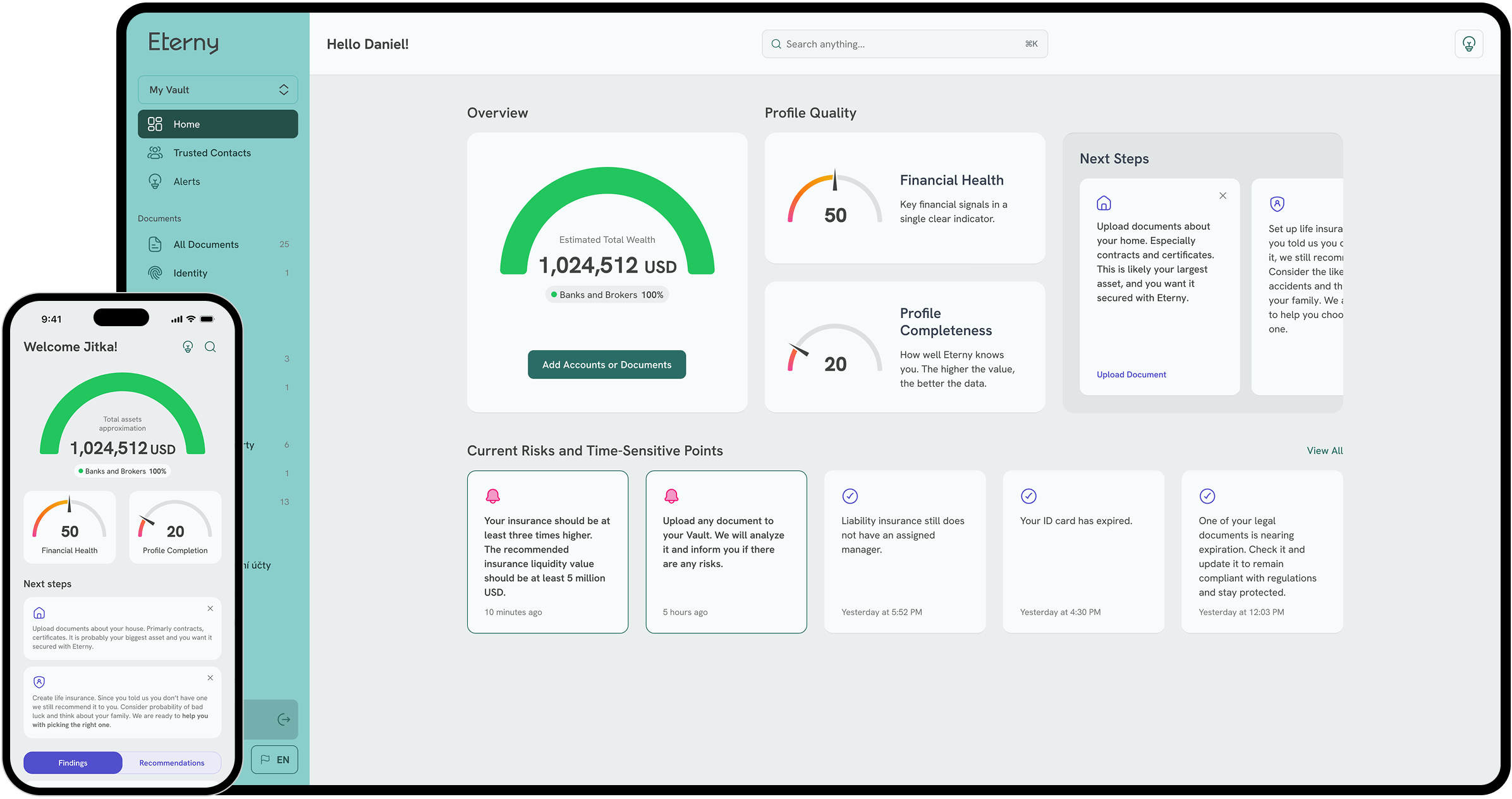 Eterny surfaces what needs your attention. Missing beneficiaries, underinsurance gaps, upcoming renewals, and policy mismatches, before they become costly problems.